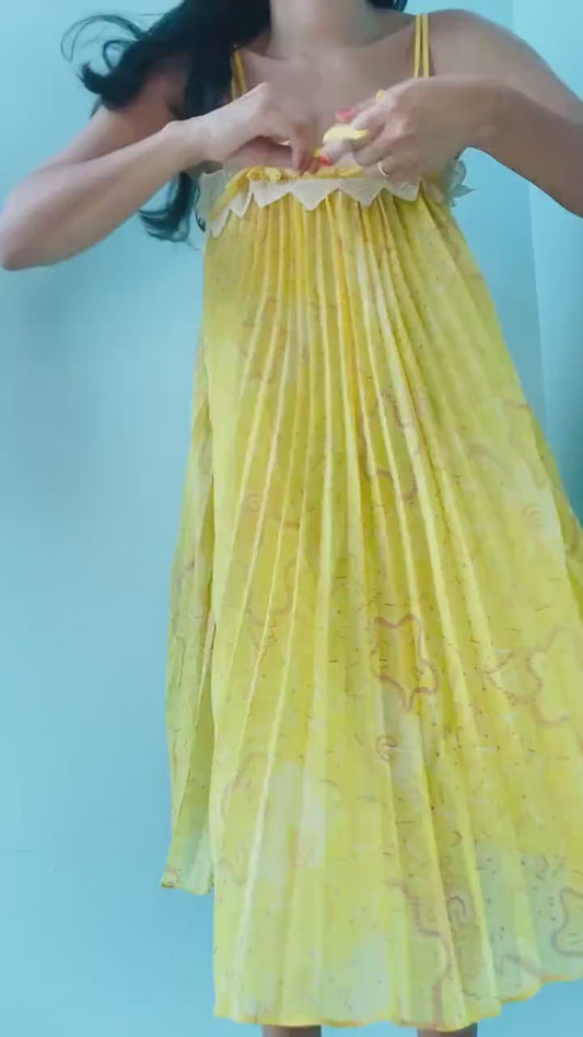 70s Zandra RHODES Yellow Pleated Lace Trimmed Tent Slip Dress