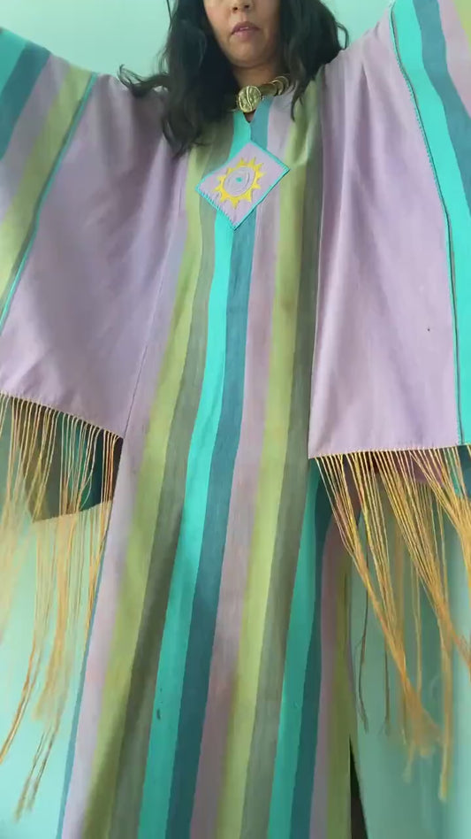 70s Josefa Ibarra Cotton Striped Fringed Caftan Maxi Boho Hippie Dress