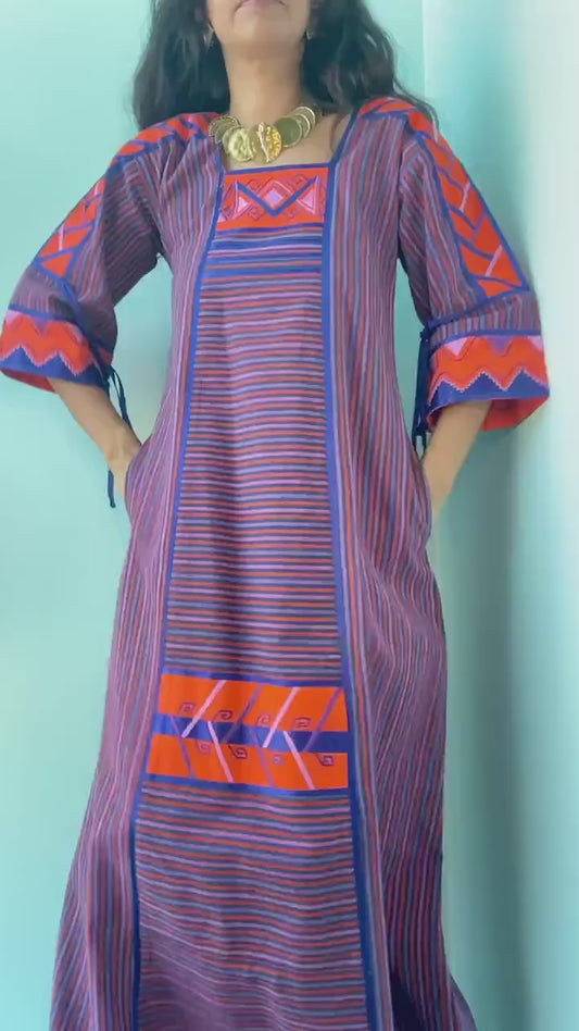 70s Josefa Ibarra Mexican Long Sleeves Purple Organic Cotton Embroidered Long Unisex Maxi Caftan Dress Bell Sleeves