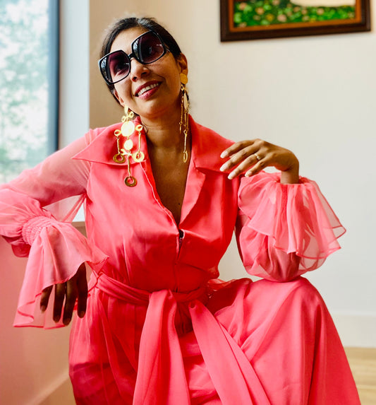 Anne FOGARTY Pink Chiffon Ruffled Sheer Dramatic Sleeves Butterfly Collar Maxi Dress