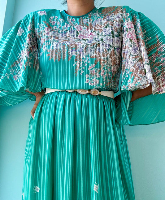 Vintage Hanae Mori Green Floral Print Ruffled Sleeves Maxi Dress