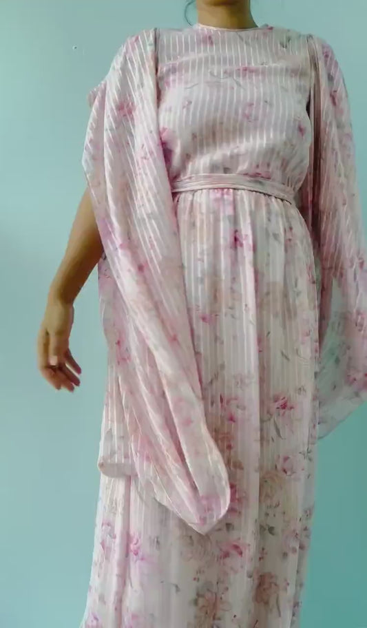 Vintage Hanae Mori Pink Rose Chiffon Maxi Dress: Kimono Sleeves