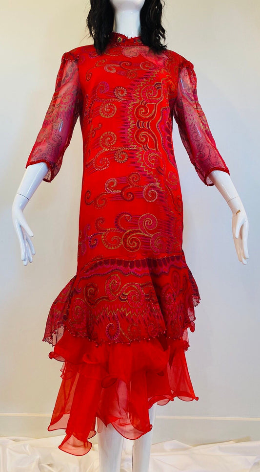 Vintage 80s Red Vibrant Zandra Rhodes Silk Tulle Party Dress Vintage Couture