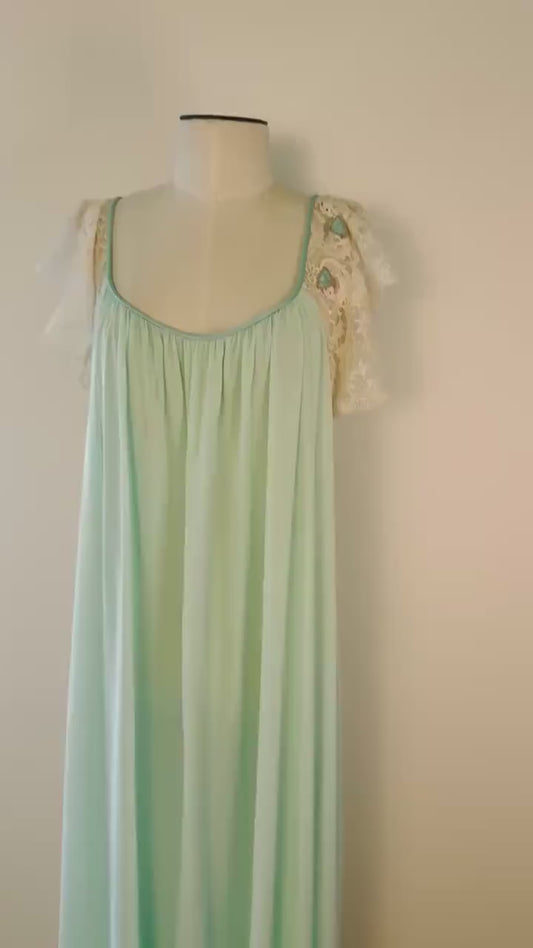 70s Lucie Ann Nylon and Lace Sweeping Green Maxi Negligee