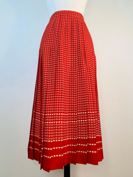 Vintage Red Printed French Preppy Pleated Below The Knee Skirt Size 40 Billy Bonny