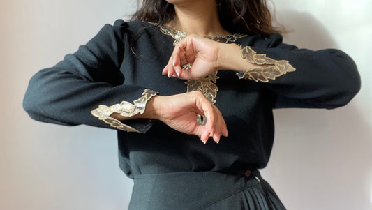 Vintage 80s Christian Dior Wool Crepe Gold Leather Detail Long Sleeve Top