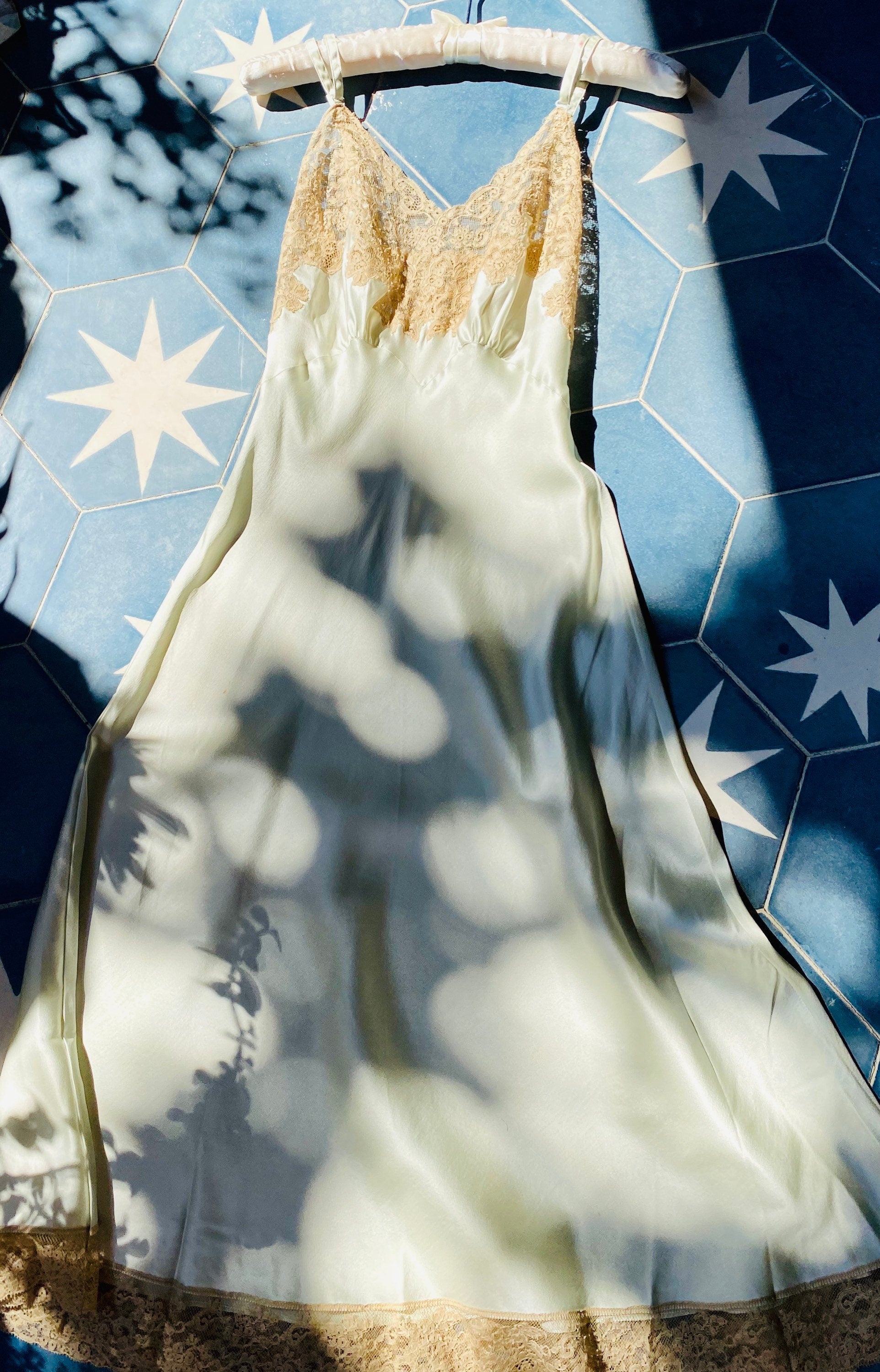 Stunning! Mint green silk. Ivory lace. Excellent vintage condition.