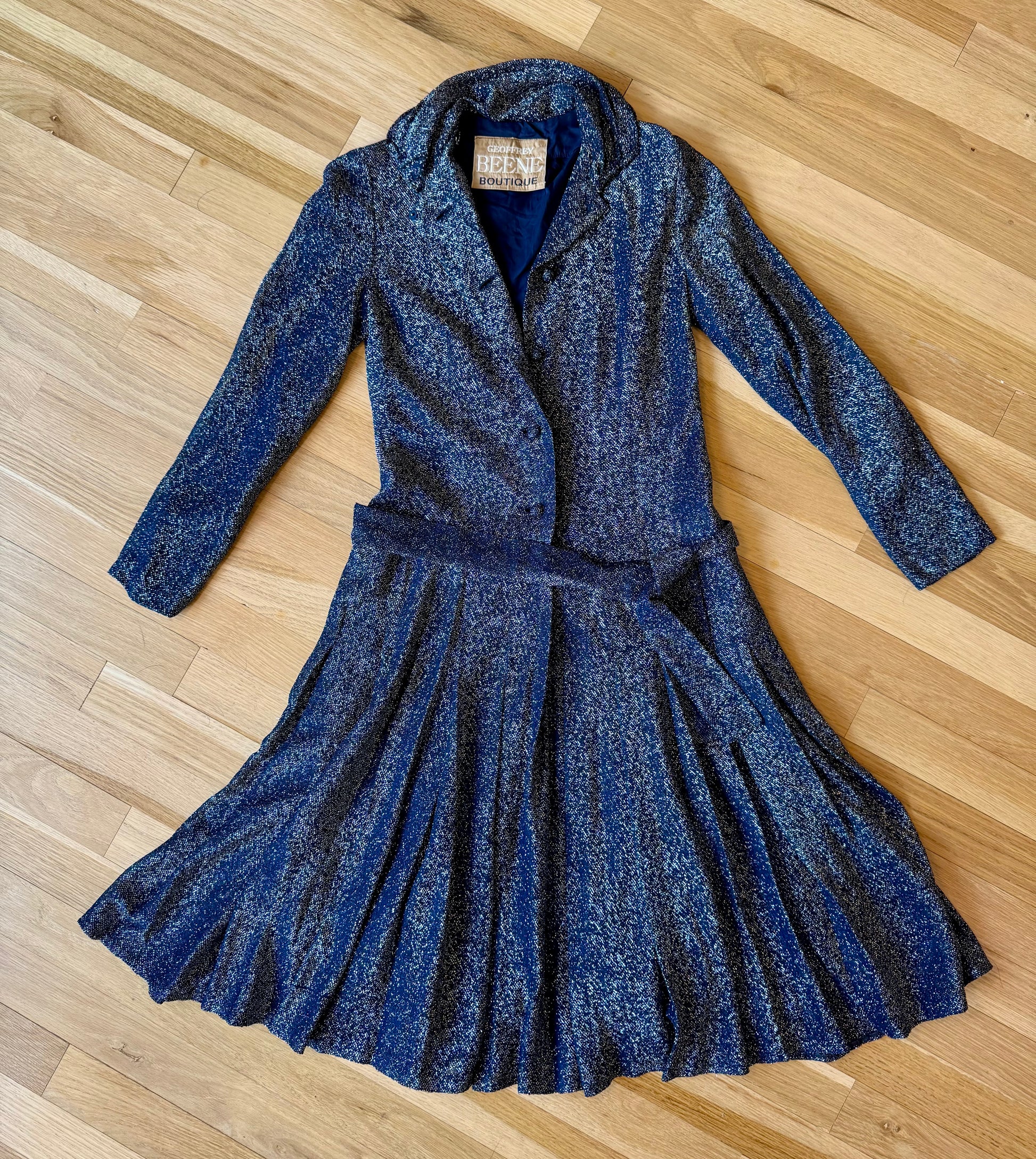 I love Geoffrey Beene designs and I decided to start posting them online. This one is from the 1960s, navy and silver Lurex super shimmery fabric. Drop waist, high neck option, pleated skirt that hits above the knee. Wide belt attached, fabric covered buttons, sim sleeves. Lined in a soft navy rayon.