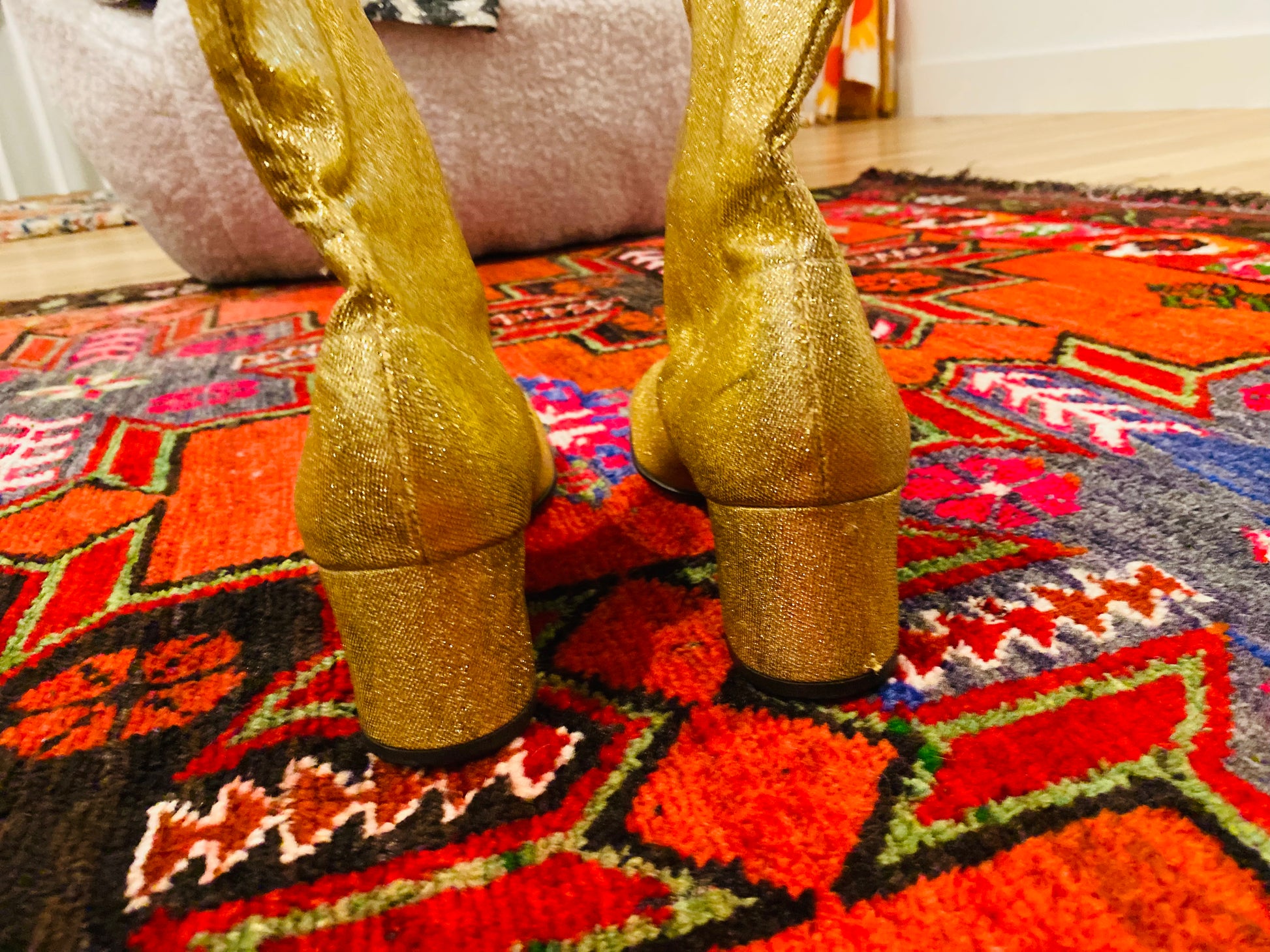 60s Gold Metallic Lurex Stretchy Ankle Boots Size 9 2" Heel