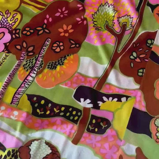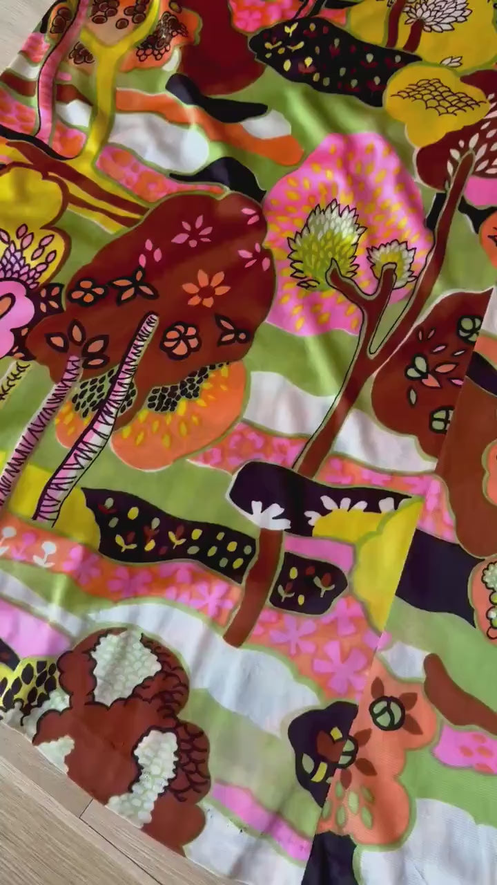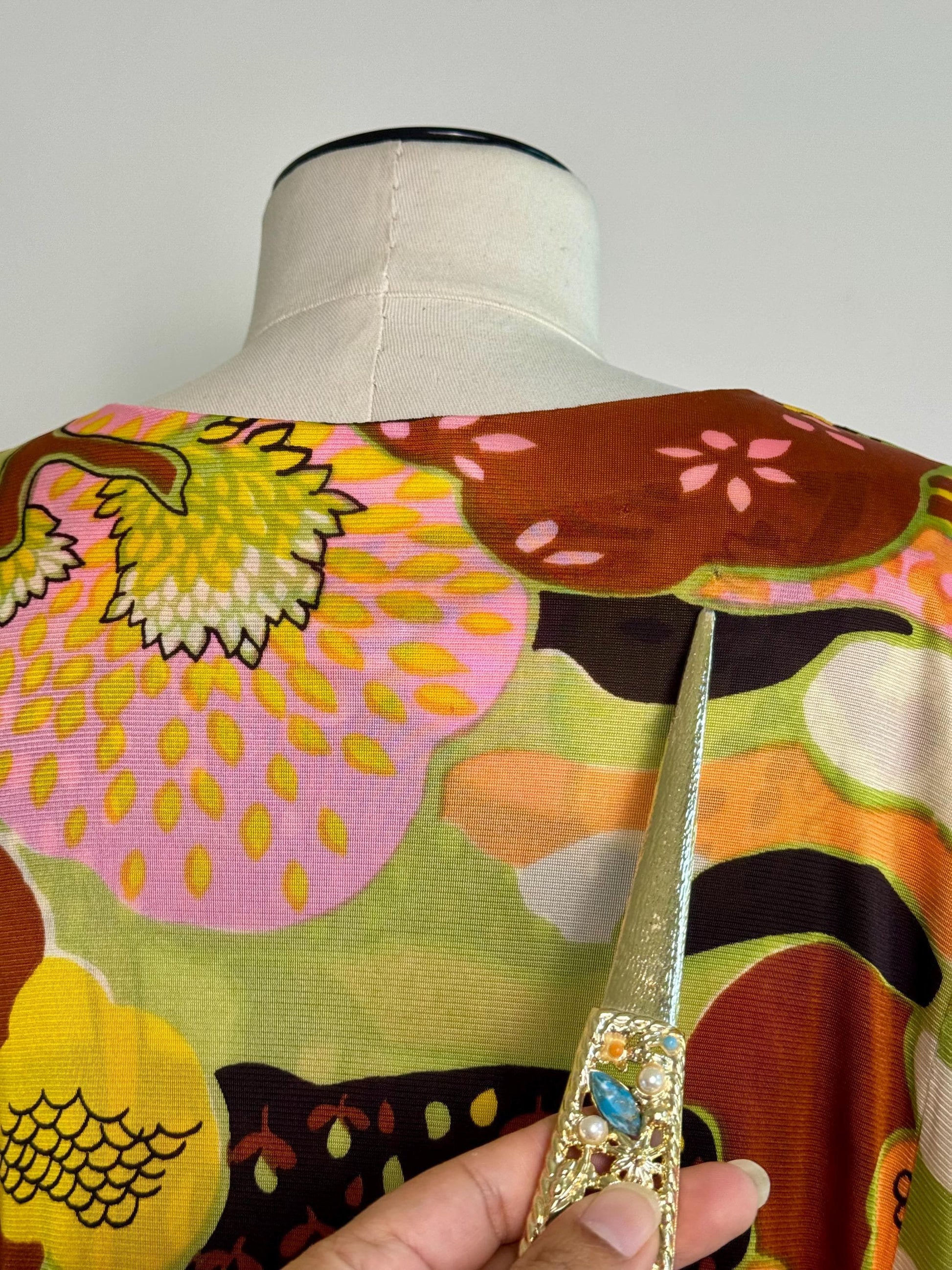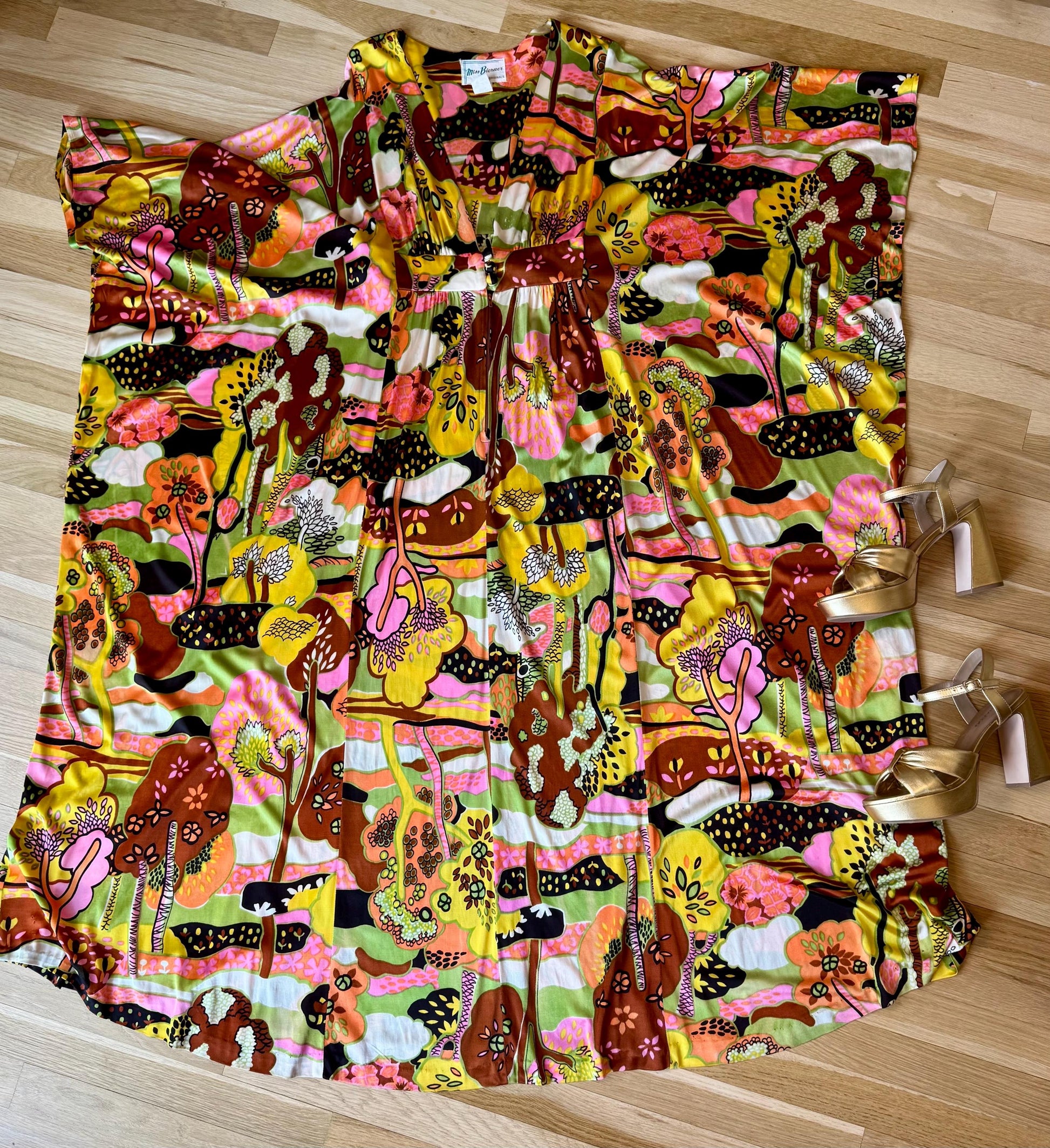 I am selling this from my own closet since I never wore it and it is too fabulous not to be out and about. The print, drape and silhouette is what makes this dress a real gem. The bright and colorful psychedelic landscape is so dang pretty! There are two thick stretchy panels inside that cinch at an empire waist causing a beautiful drape from its cocoon sleeves. Zipper and button closure at front. Super low neckline. This Miss Bierner caftan dress was well loved by its original owner, there are several tiny holes. Please see the photos.