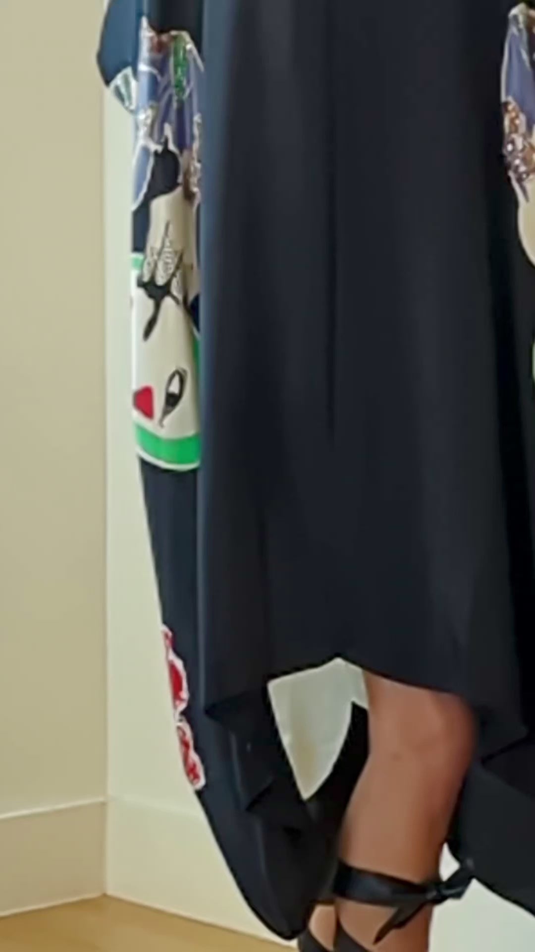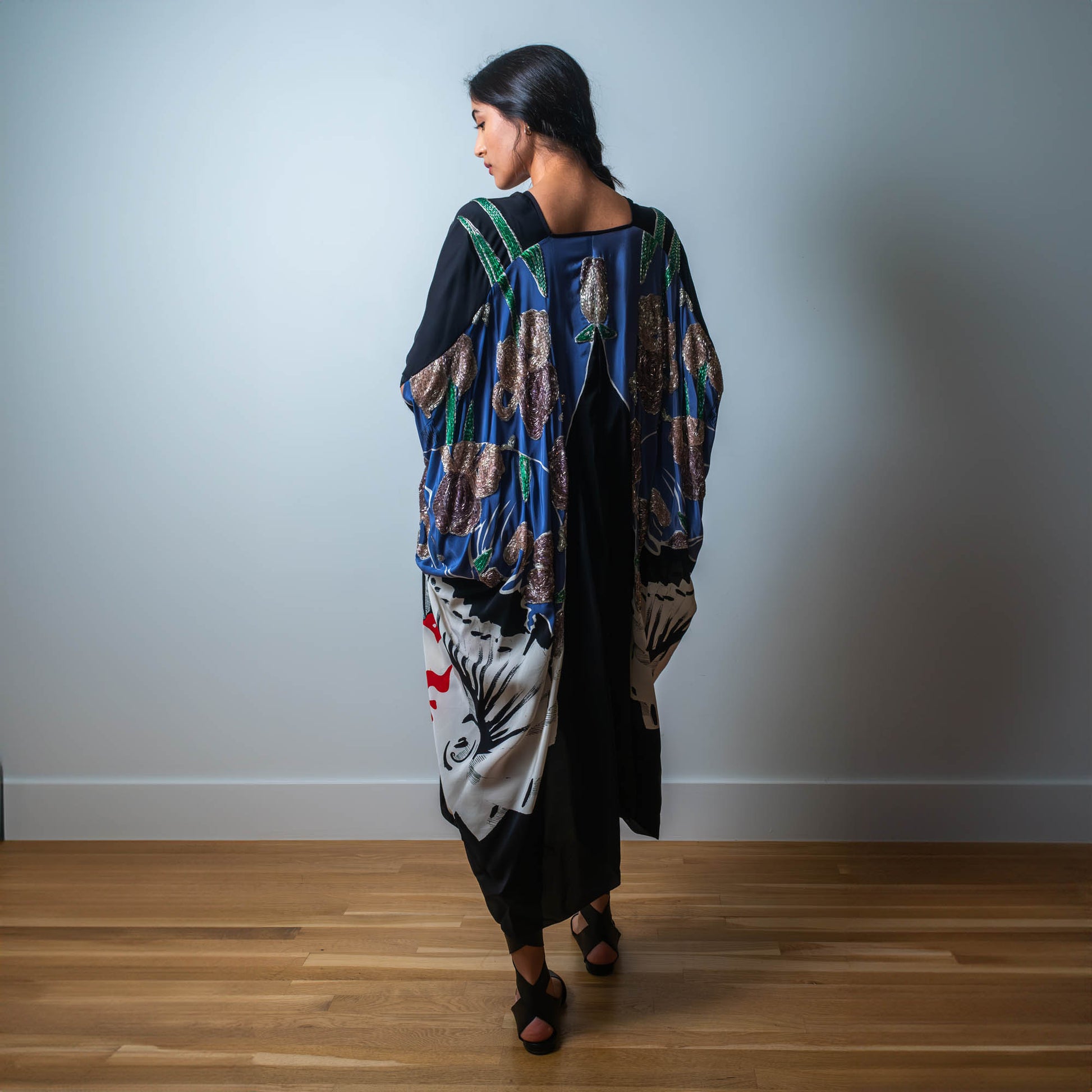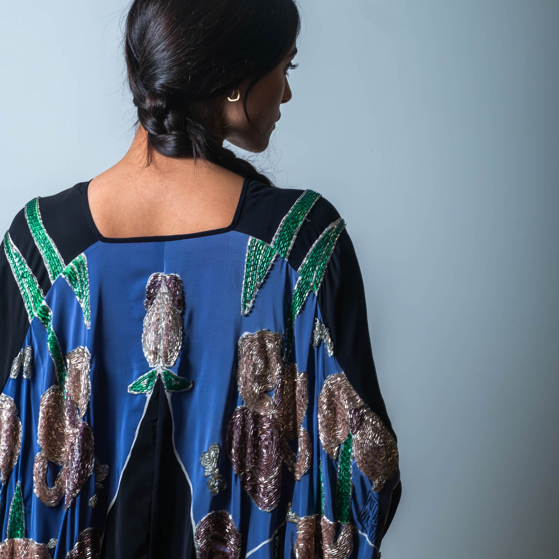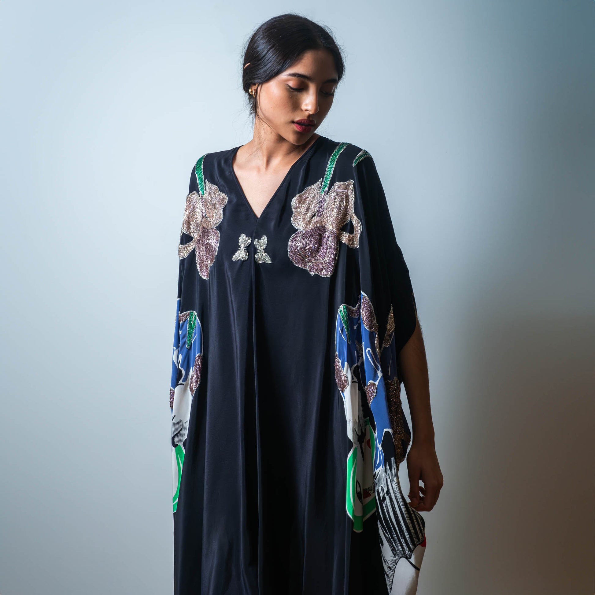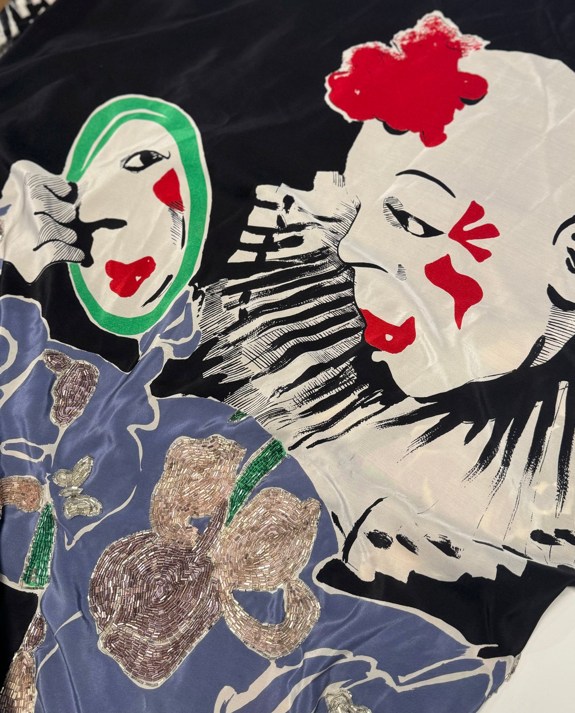 This piece has two large glass beaded and printed flowers with butterflies coming down the shoulders to the bust. At the side there are these Avantgarde faces looking into bright green hand mirrors.These images are placed upside down and mirror each other! The hand beading continues to the back as if you were a butterfly. The caftan falls lower at the back just as seen on the model. Absolutely fabulous!