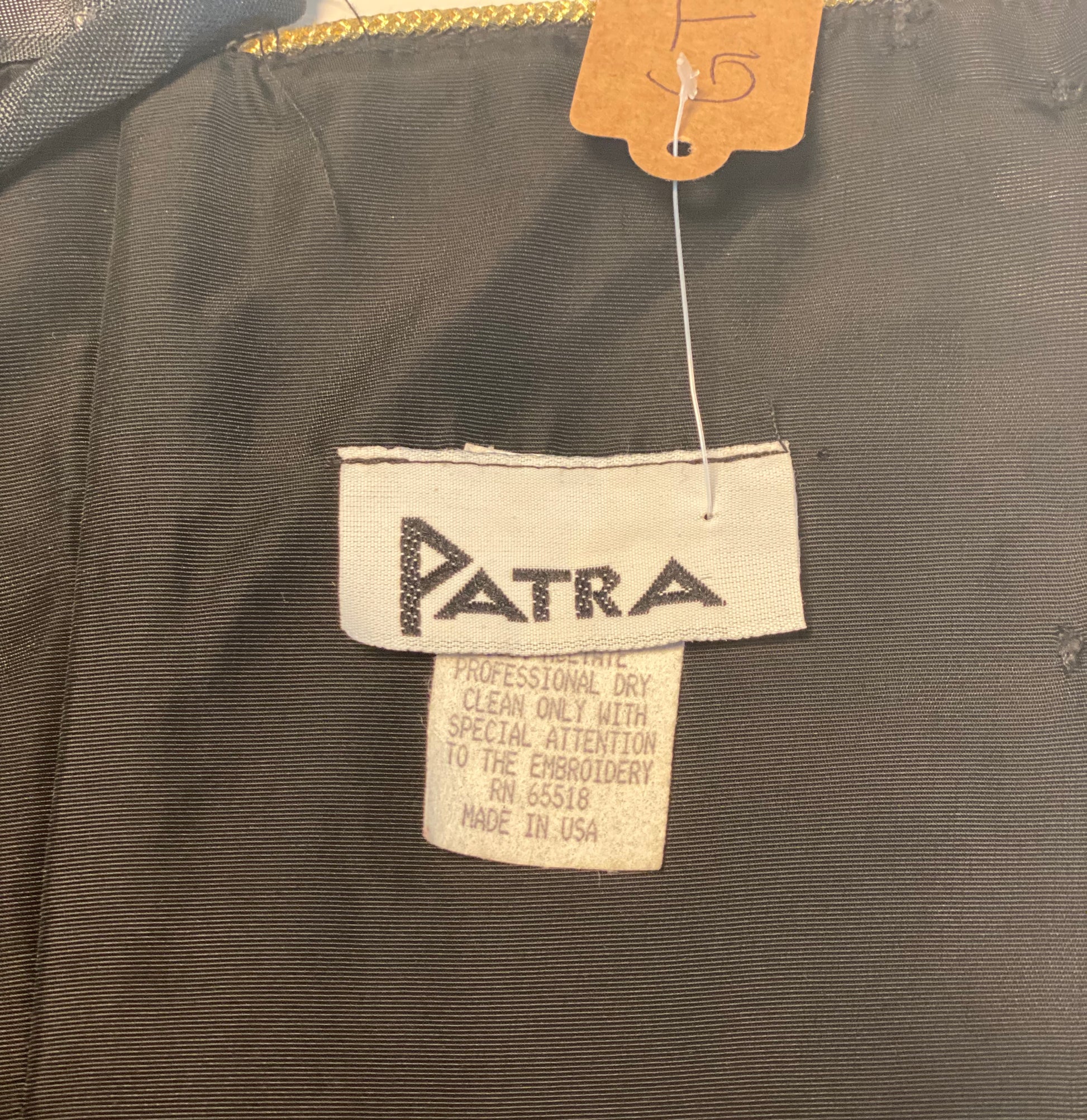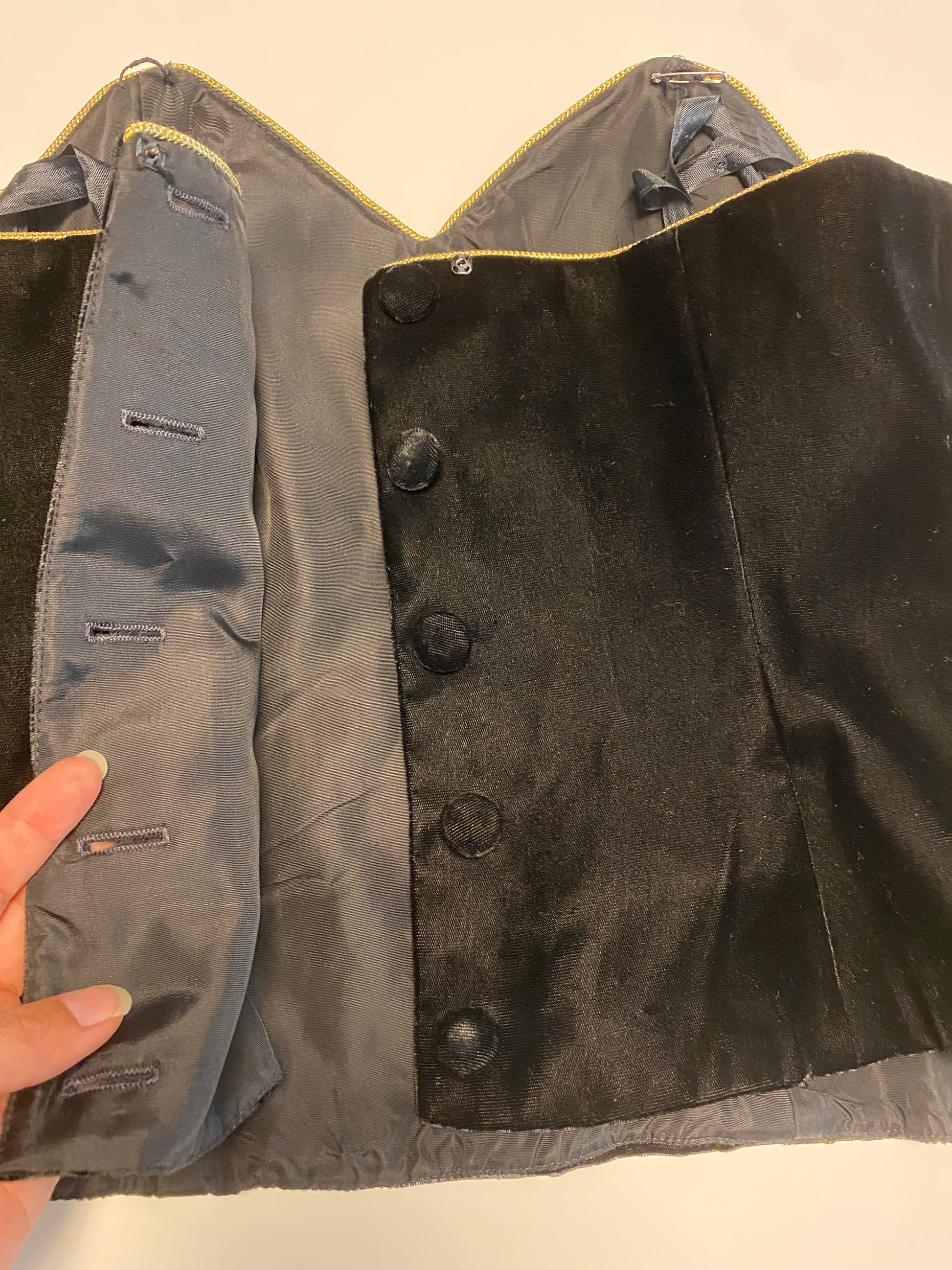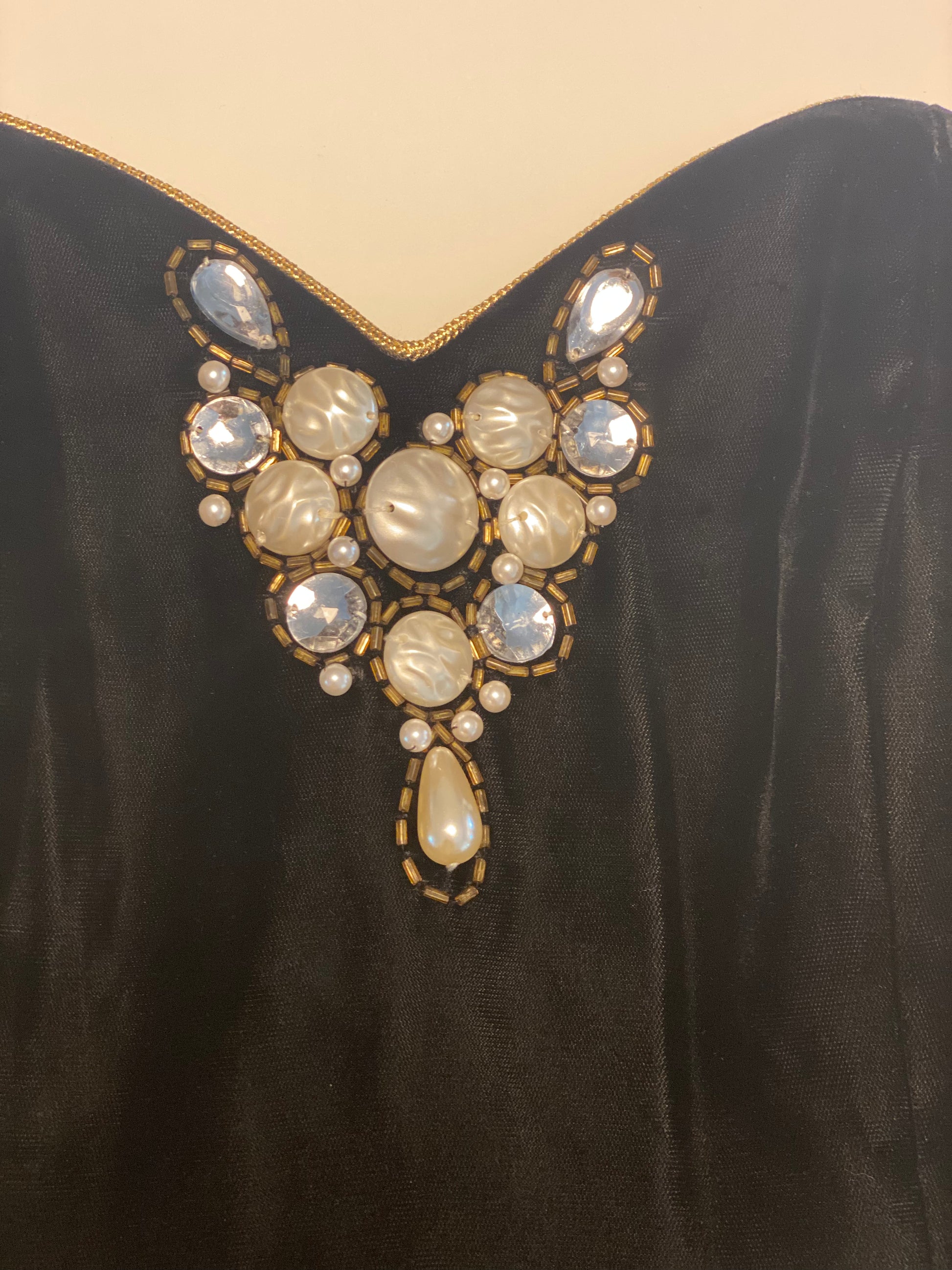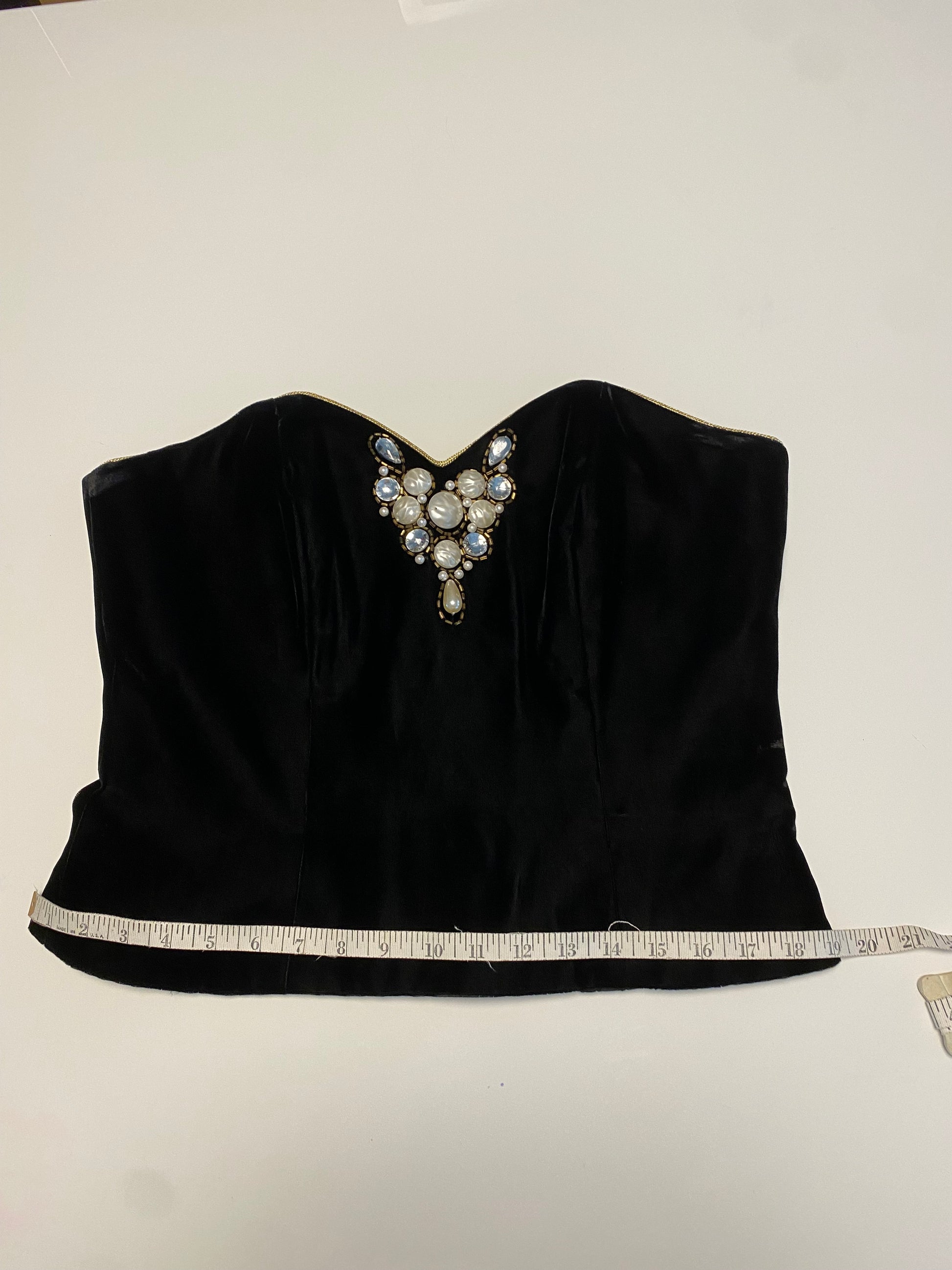 What a sexy bustier that is perfect for the holiday season! From famed 80s and 90s party wear designer Patra. I would love to see this over a crisp white shirt and jeans. It gives such strong 90s La Croix vibes. If it fit me, I would keep this piece. Black velvet with gold lurex piping. Oversized covered buttons at the back. Cinched at waist. Pearls and crystals embellished at the sweetheart bust line.