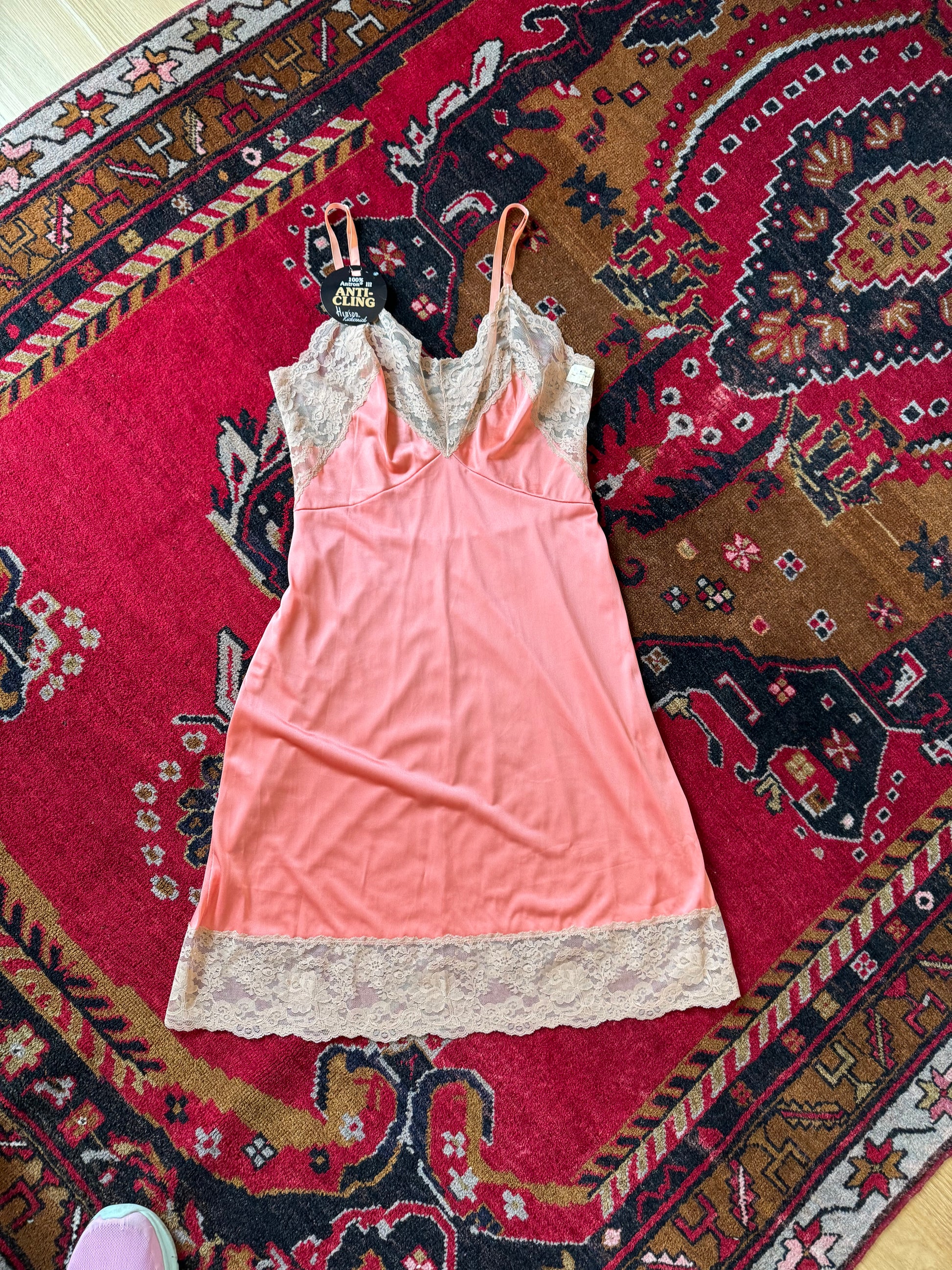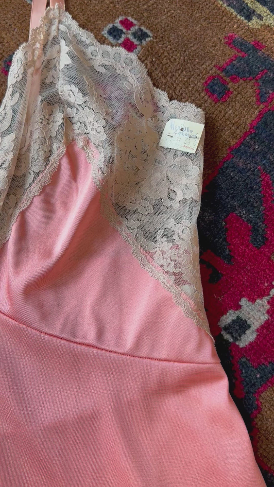 This is such a glamorous vintage slip. I acquired it along with other lingerie pieces from a Venezuelan lady that had moved to Dallas in the 60s. This particular one is new with tags. Apricot peach in color with beautiful tan lace detail.