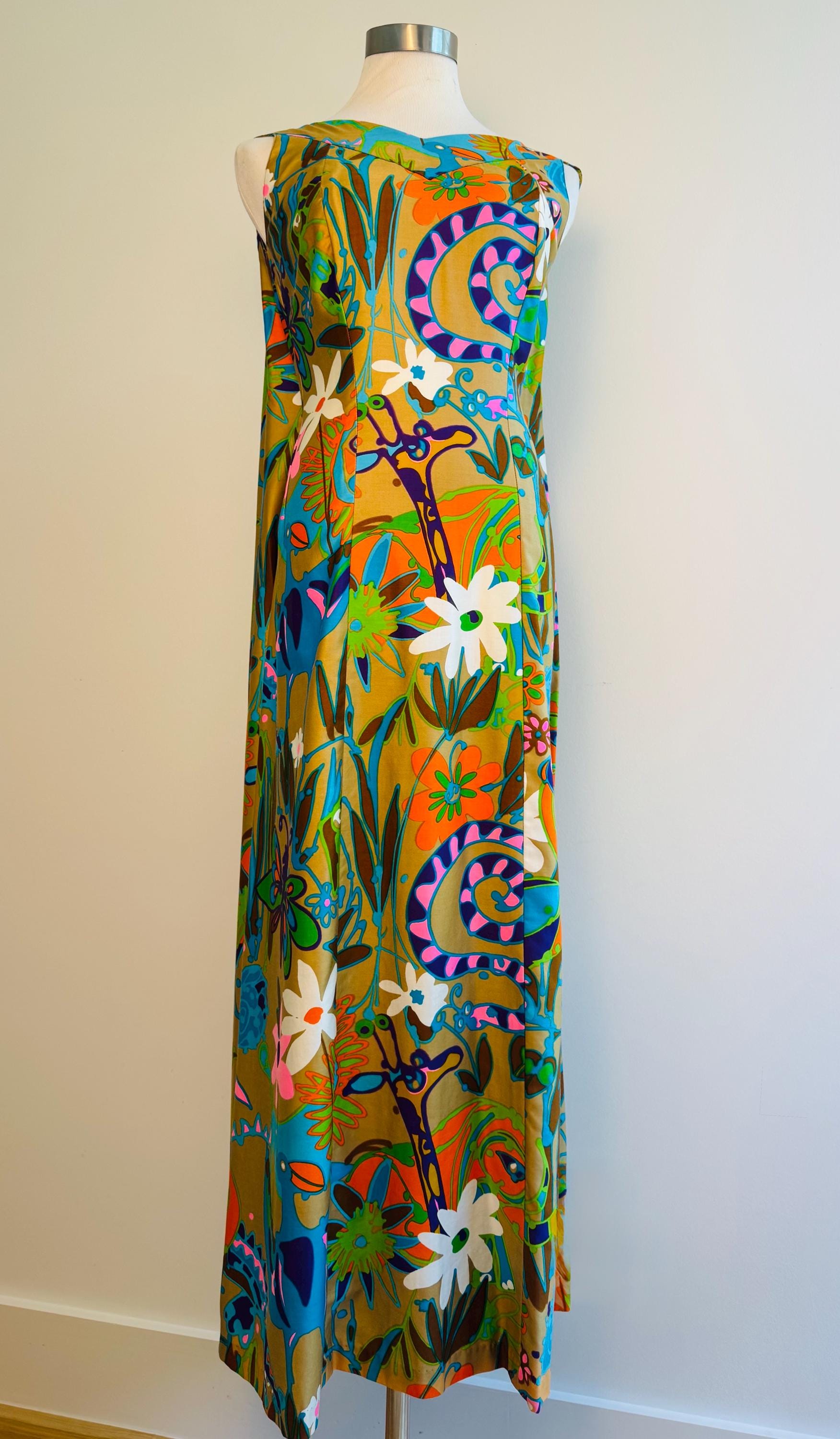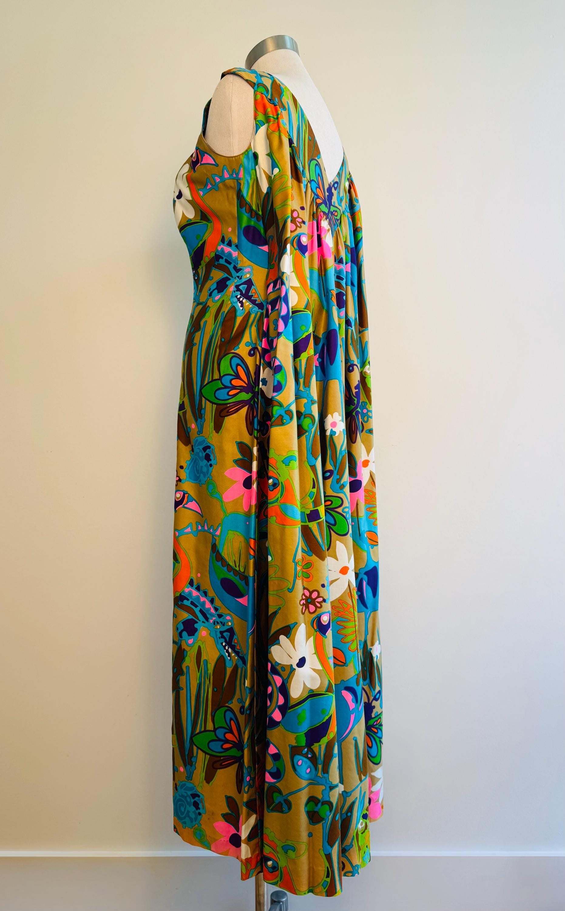 I love me a vintage homemade dress! The nostalgia of a time when people made stunning pieces at home. 60's cotton capelet dress in bright water color jungle print. Wide triangle neckline, interior elastic band to cinch at the waist and to create a dramatic cape at the back. Pull over design. This dress was never worn!