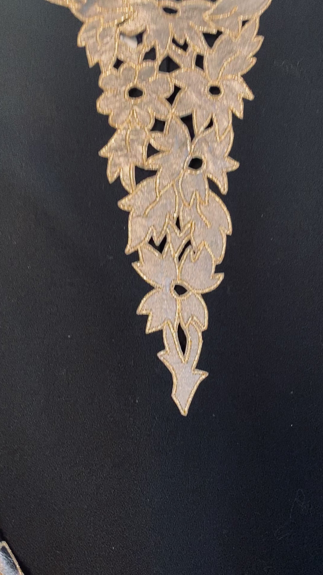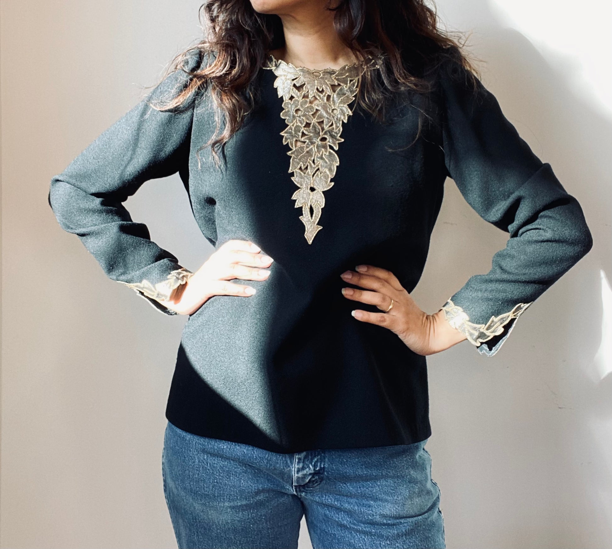 I absolutely love this top and have had it for a really long time. It is composed of black wool crepe with beautiful gold leather floral application at the bust and cuffs. The bust has cutouts on the leather design that trims the flowers and leaves The same with cuffs, it is trimmed around the leaves and place where they split the cuffs. The shoulders are lightly gathered and puffed. Back wrapped button closure. This top will elevate any outfit.