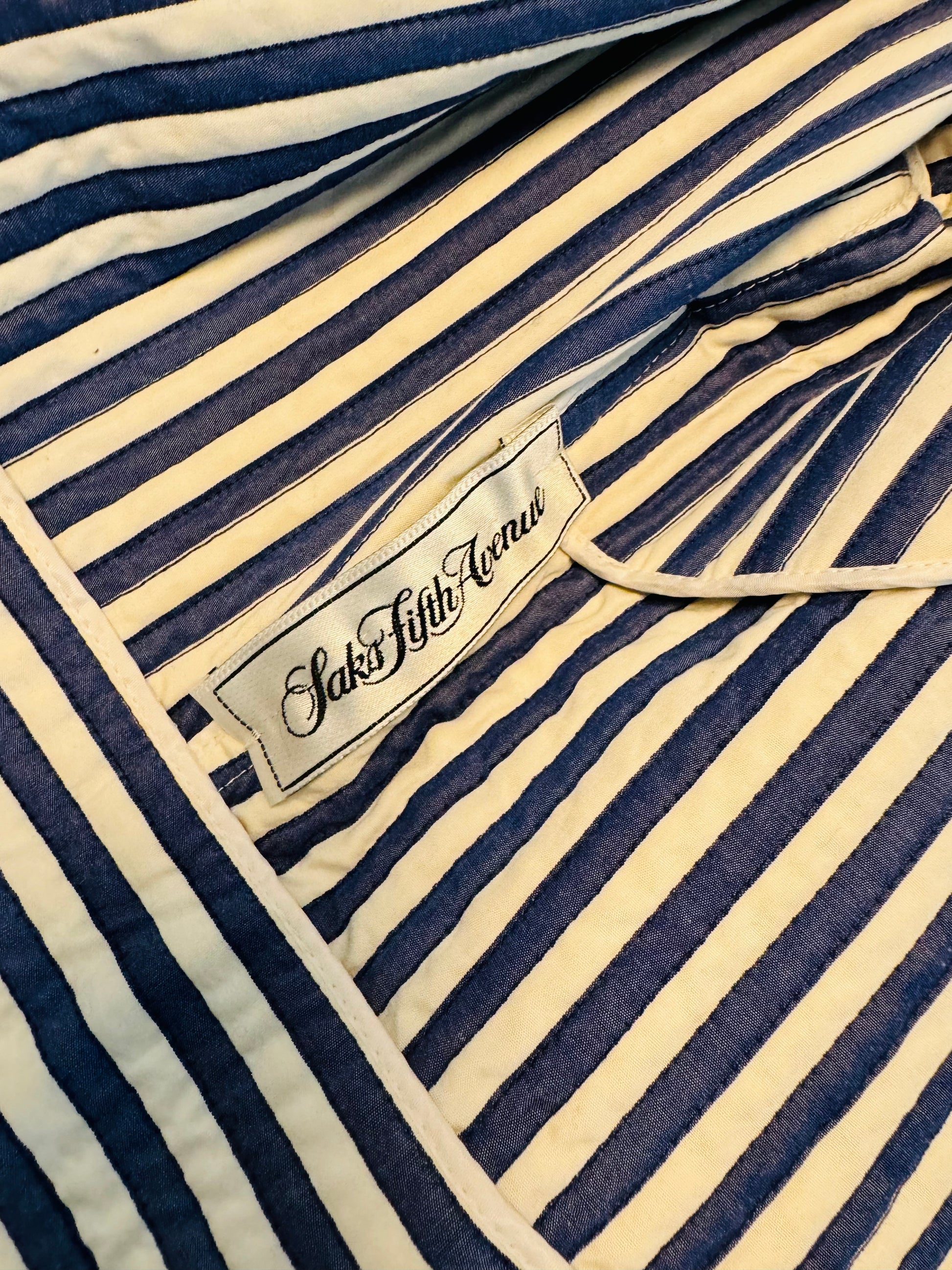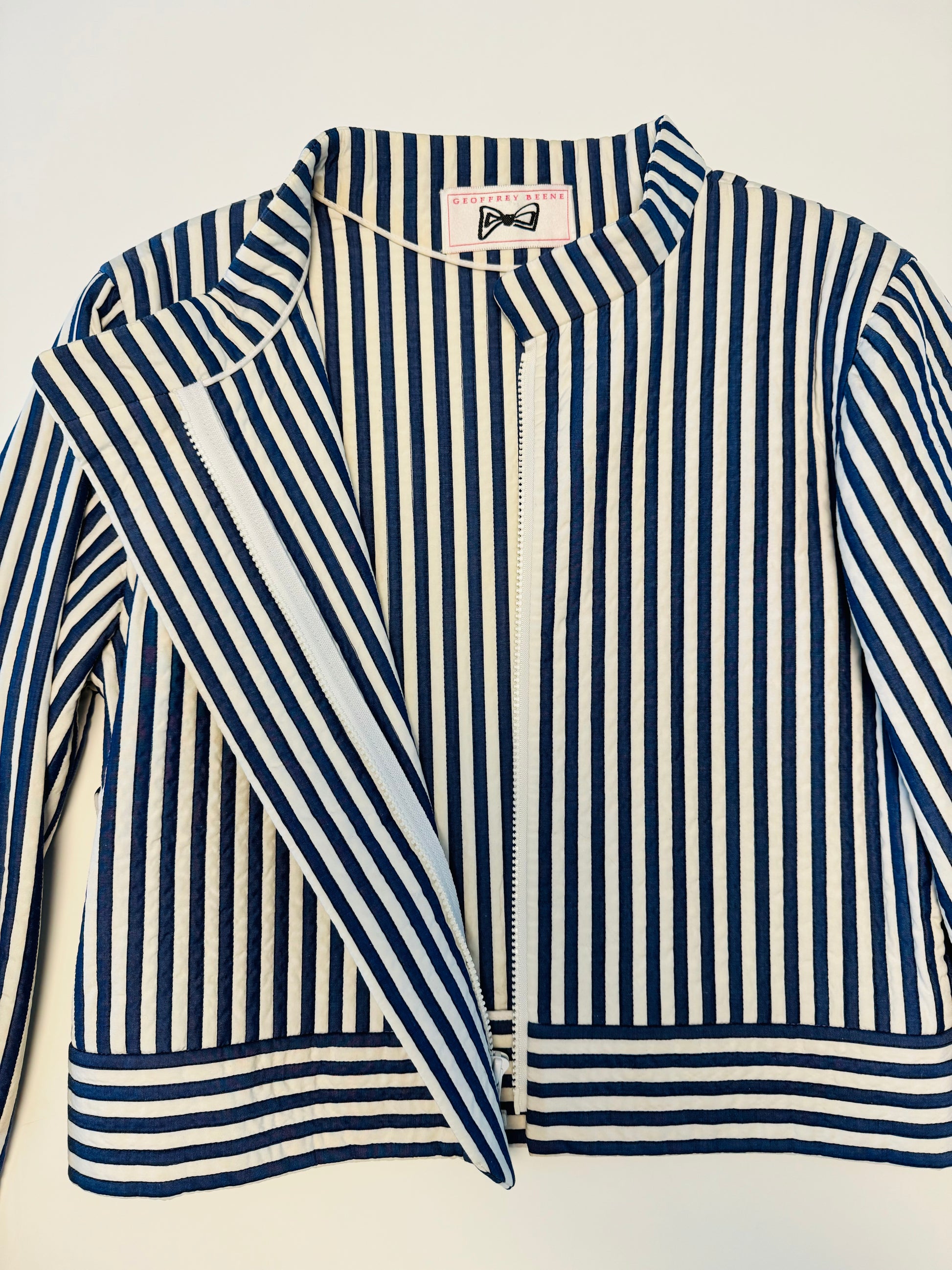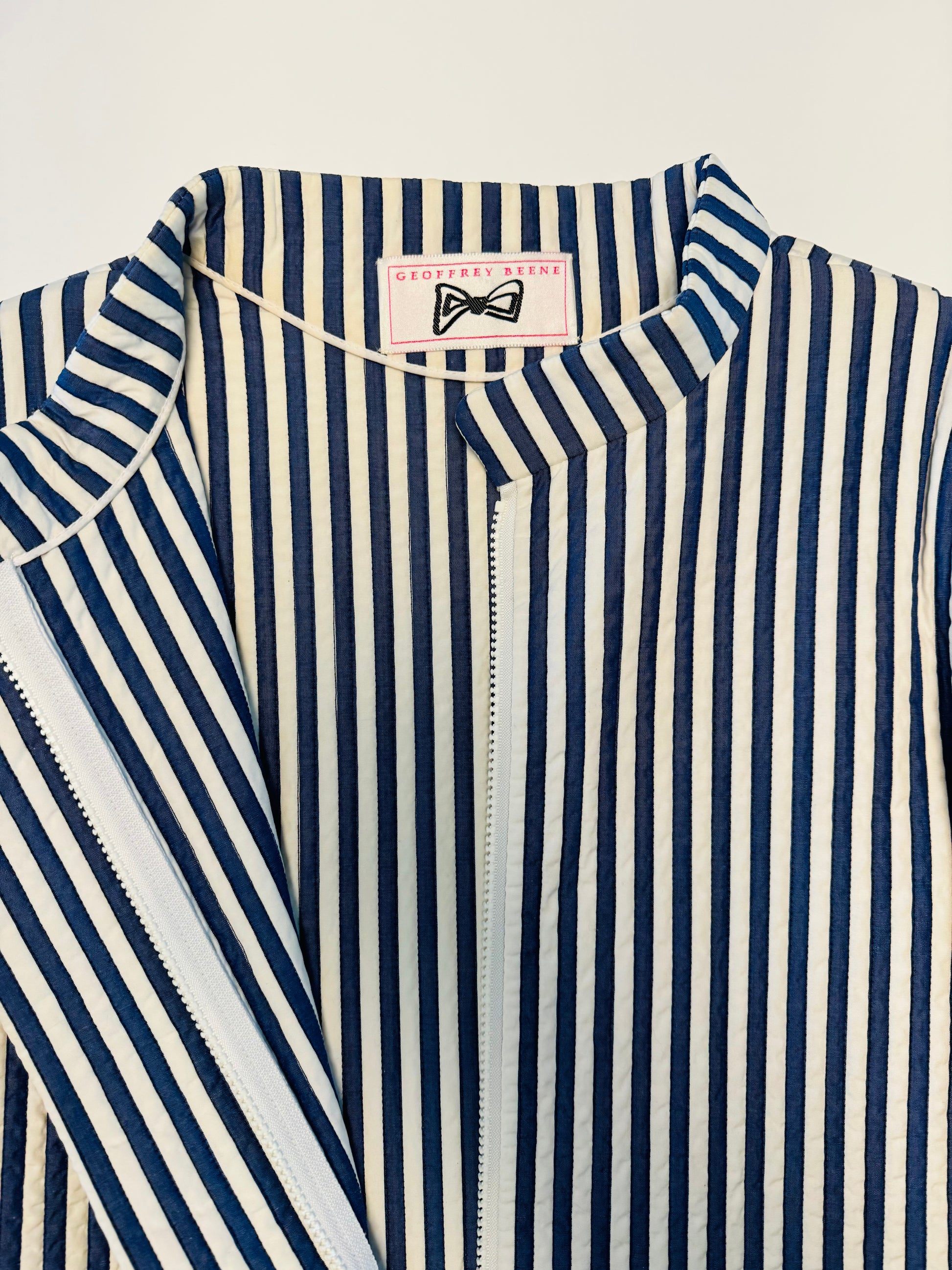 This late 80s early 90s Geoffrey Beene ensemble is so cool with the striped cotton seersucker bodice and asymmetrical jacket. Cinched and darted at the waist. The navy blue pants feel like silk crepe. Tapered legs. Back zipper closure on the jumpsuit. The jacket has a asymmetrical zipper closure and these panels around the arms. Geoffrey Beene has had his whimsical and sculptural jackets displayed in museum galleries. Union made in the USA. Labeled 8.