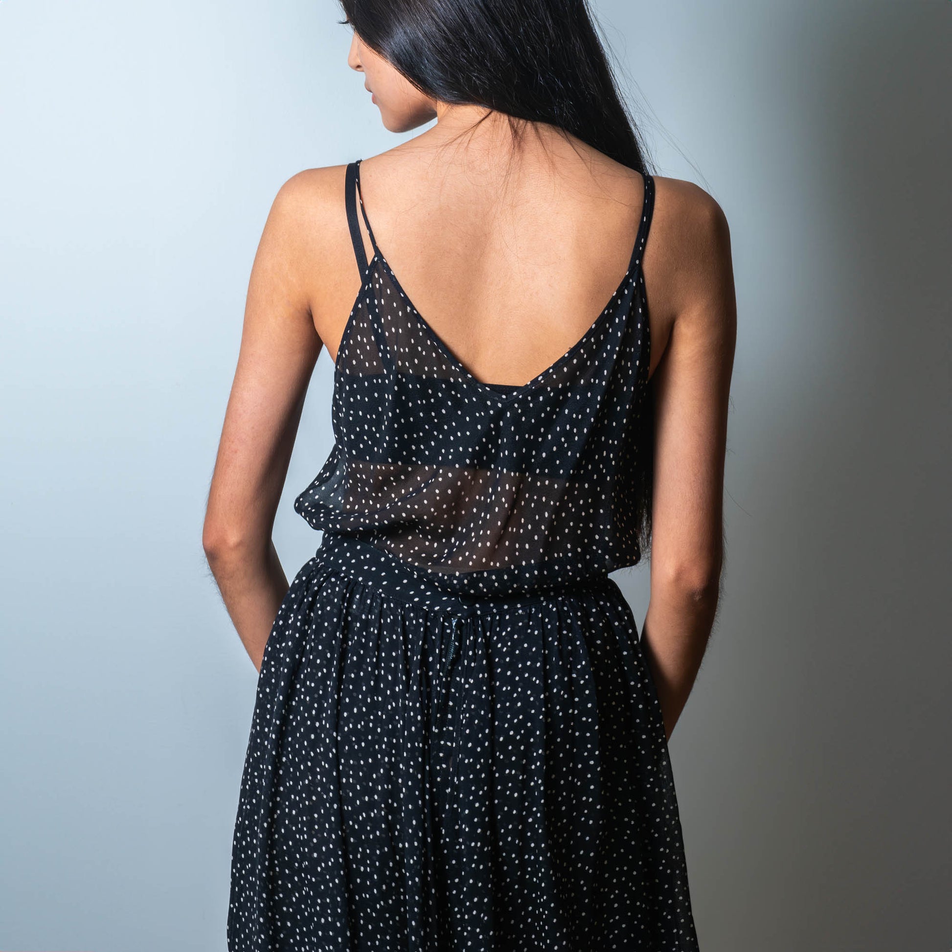 The paper weight silk ensemble is black with white polka dots. The tank is semi sheer and the skirt is layered with a handkerchief hemline. The tank is a pull over, and the skirt has a back zipper closure. It is long so please read the measurements. Made in Italy. Labeled 42.