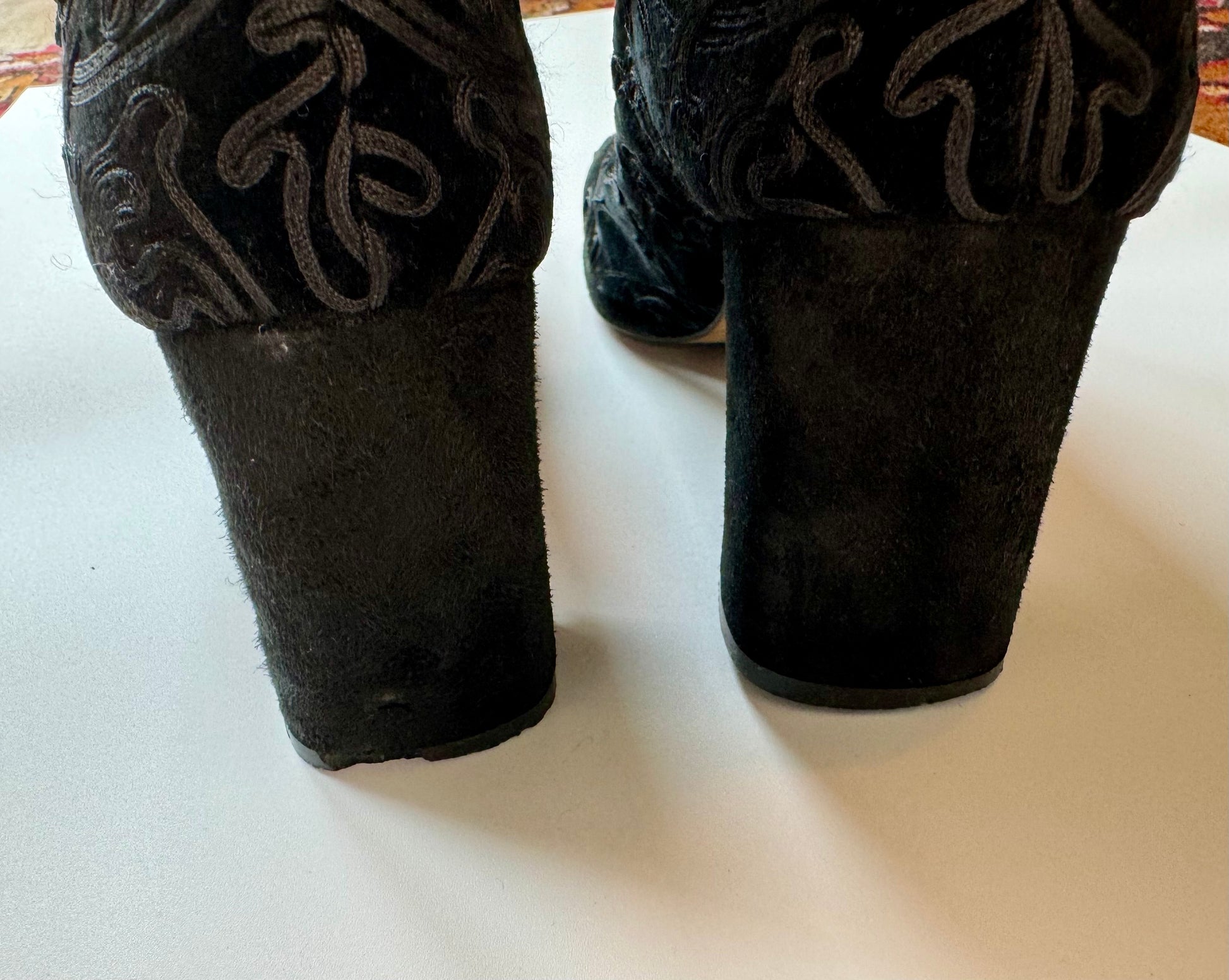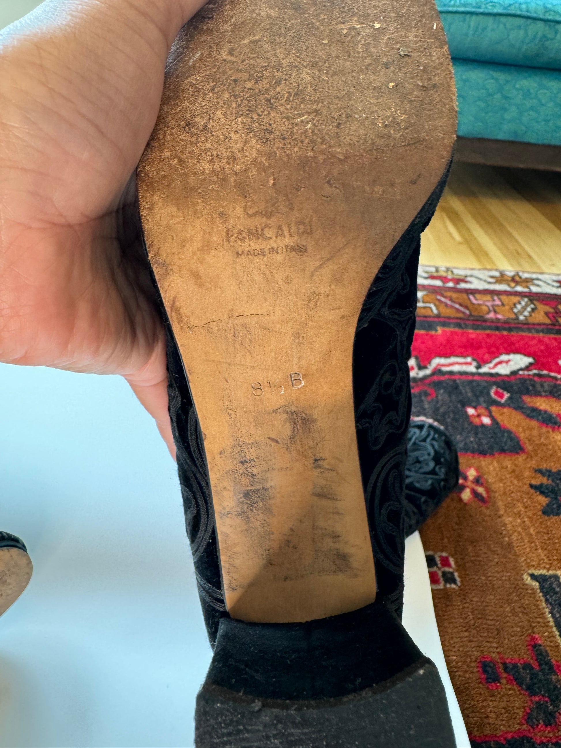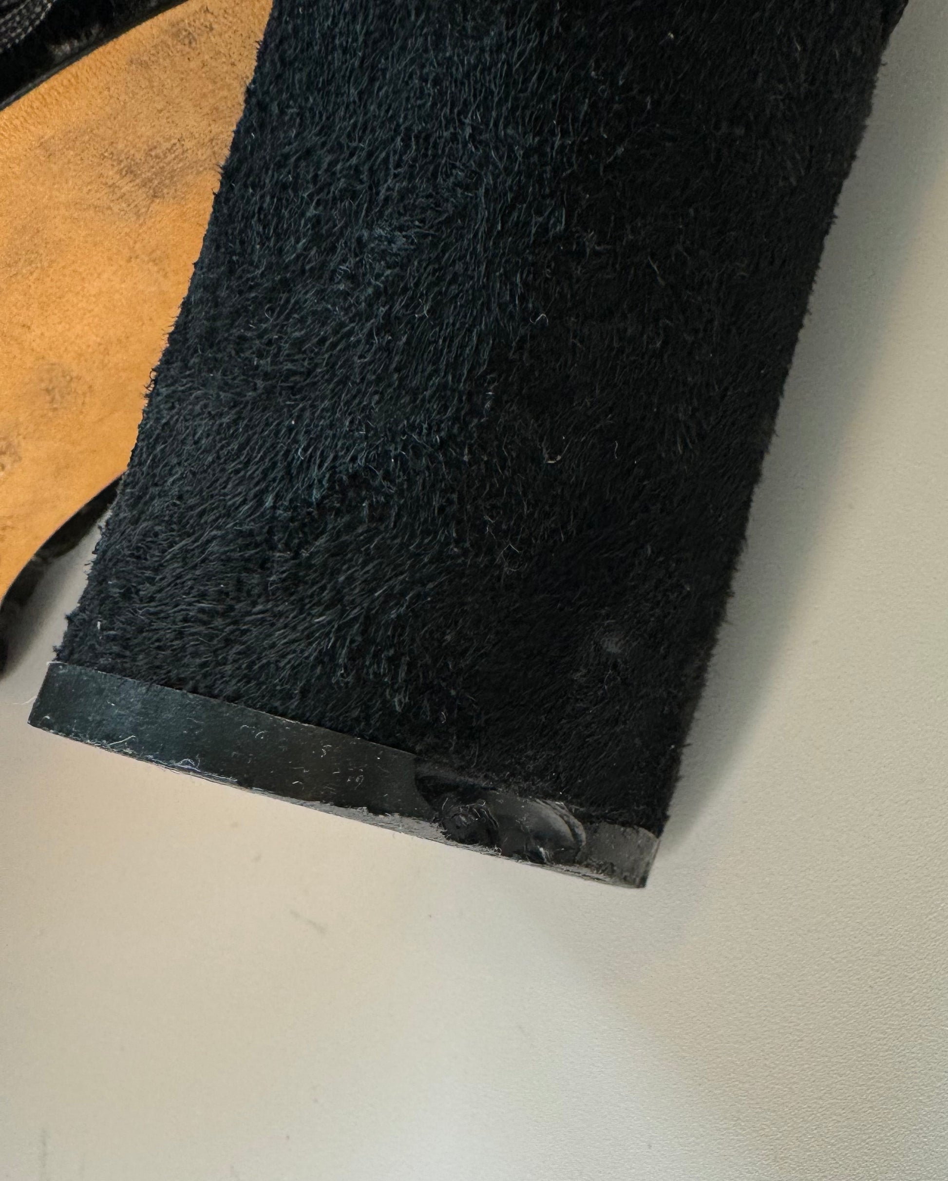 These vintage boots have so much sass! Black velvet with super cool ribbon design. Stacked suede heels. Soft fabric lining at the shaft but leather at the foot. Made in Italy.