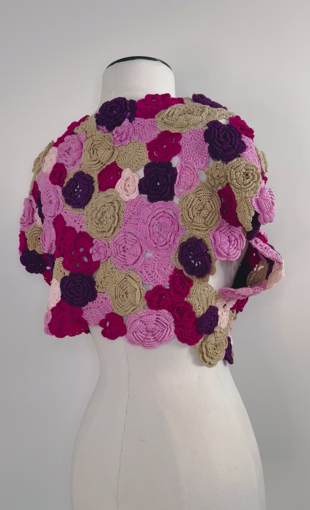Stunning Moschino Cheaop and Chic bolero jacket. I love a good Bolero jacket. I know it is old school but the Bolero jacket is so chic and sensible. It is the perfect piece for spring and summer events where it's warm outside but air-conditioned inside. Have a great strapless piece but need a bit more fabric for a particular event? Grab a Bolero! This one is hand crochet into multiple 3D florets in multiple colors of pink, purple, peach and to keep it neutral khaki. It ties with purple ribbons at the front. I love the Asymetrical shape, it gives the piece some edge.