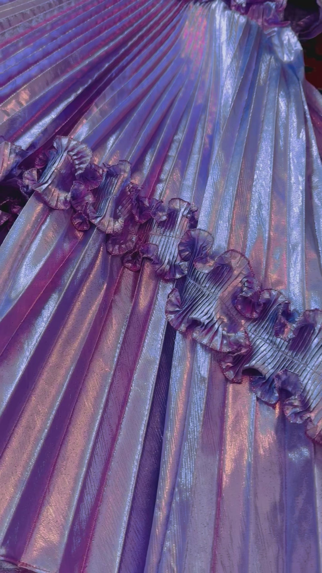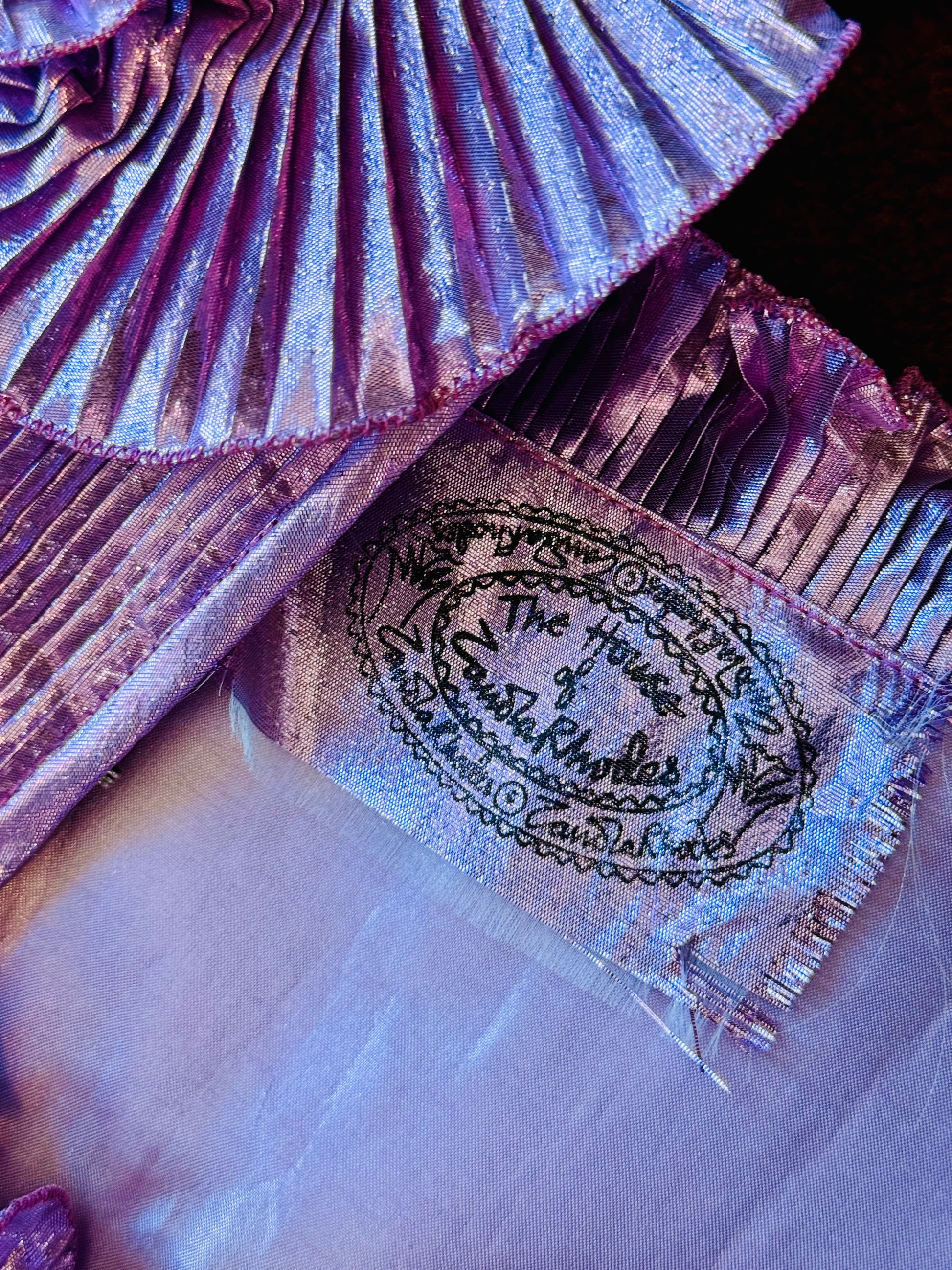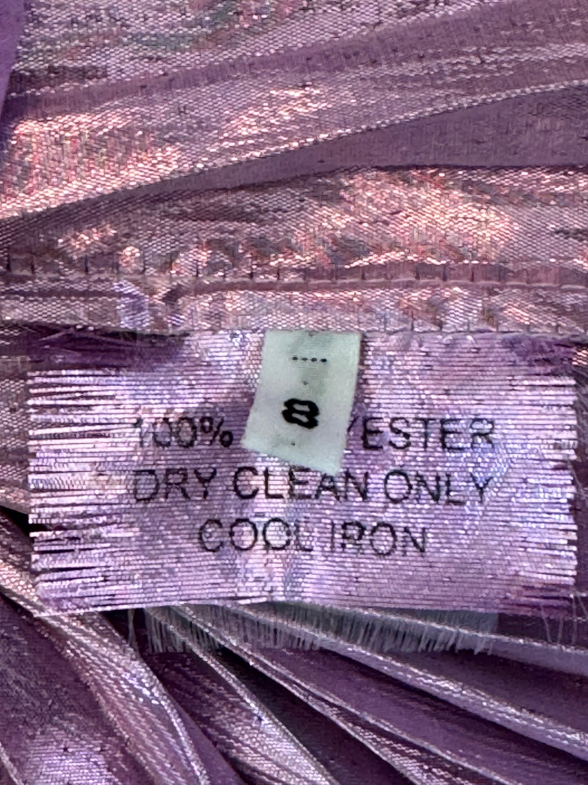 Okay so I never thought I would part with this dress, even though it is way too small. I have a daughter that I know will be mad about this, but the reality is that I have too many dresses in my archives and new medical bills. Plus with a mom that collects rare vintage designer pieces, she will be just fine. This is the iconic Pat Cleveland disco dress that Zandra Rhodes relaunched for her Archive Collection. It is just stunning! Metallic feather weight lilac lame pleated for days. The lame is iridescent and catches all the lights making you the center of attention. It is a semi wrap dress. You pull it over and then cinch it at the waist with long sashes, there are clear snaps at the side of the skirt and hook and eyes at the center of the bust.